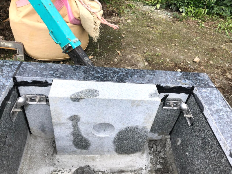 納骨堂内部です。この上に蓋石を設置するため、ここでも耐震ボンドをたっぷり塗布して準備をしています。