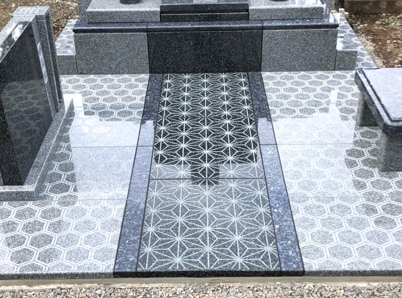 石貼り部分です。色々な模様があったのでお客様もとても悩まれて、スタッフとお客様とで何度もお打ち合わせを重ねてこちらに決定しました。お墓の造りそのものはシンプルな形ですが、こだわって考えられたこの石貼りでお客様らしさを感じられると思います。縁石に使用したブルーパールのキラキラした輝きも、より華やかな印象を与えています。