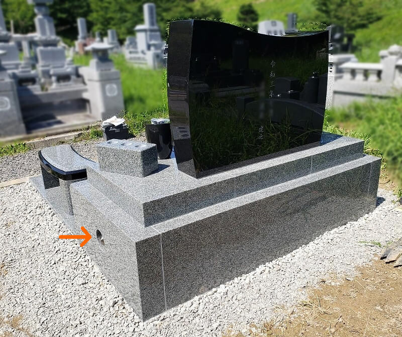 後方です。棹石背面には、建立年と建立者の方のお名前を彫刻しました。印は換気口です。左右に設置しており、雨だけでなく虫などが入り込まないように金具を取り付けています。また、お盆やお彼岸の時期にたくさんのお花をお供えするこちらの地域の風習にあうよう、三つ穴の花立てを追加で一対設置しました。