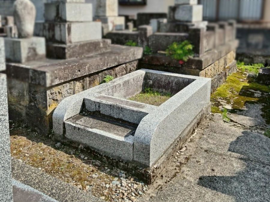こちらがお墓を建てる場所です。外柵まで出来上がった墓地を取得されていました。建てられてから時間が経ち、表面に水垢が付いてはいましたが、石自体は傷みもなくそのまま使える状態でしたので、こちらは活かして墓石部分を建立することになりました。お墓については、昔ながらの和型ではなく、高さを抑えた洋型で、明るいイメージがいいとご希望でした。