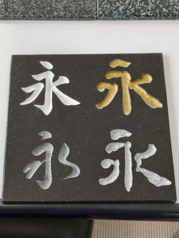 こちらは石に彫刻をして色を入れた時の見本です。金箔や白色など、実際に色を入れた時の仕上がりを見ていただけます。細部までお打ち合わせをして図面が完成し、いよいよお墓の工事に入らせていただきました。