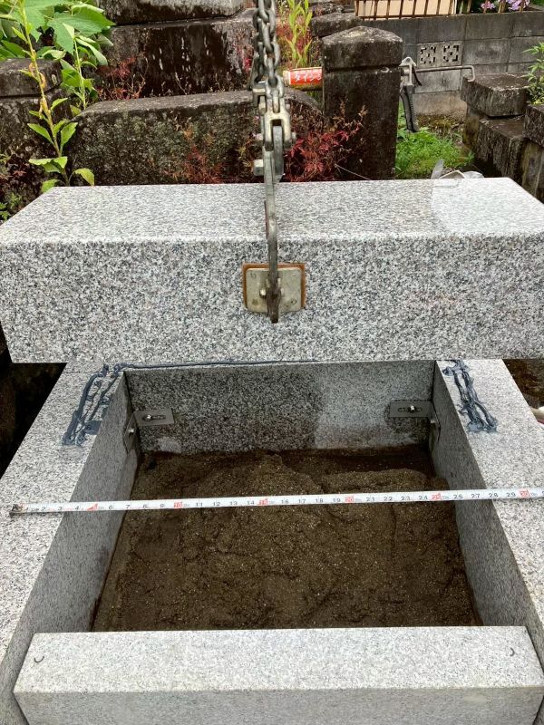 お墓本体を据えていきます。まずは、耐震ボンドを塗布した台座を据えています。据え終わったら、この上に棹石を設置して拝石などを据え、墓誌・花立などを設置したら完成です。