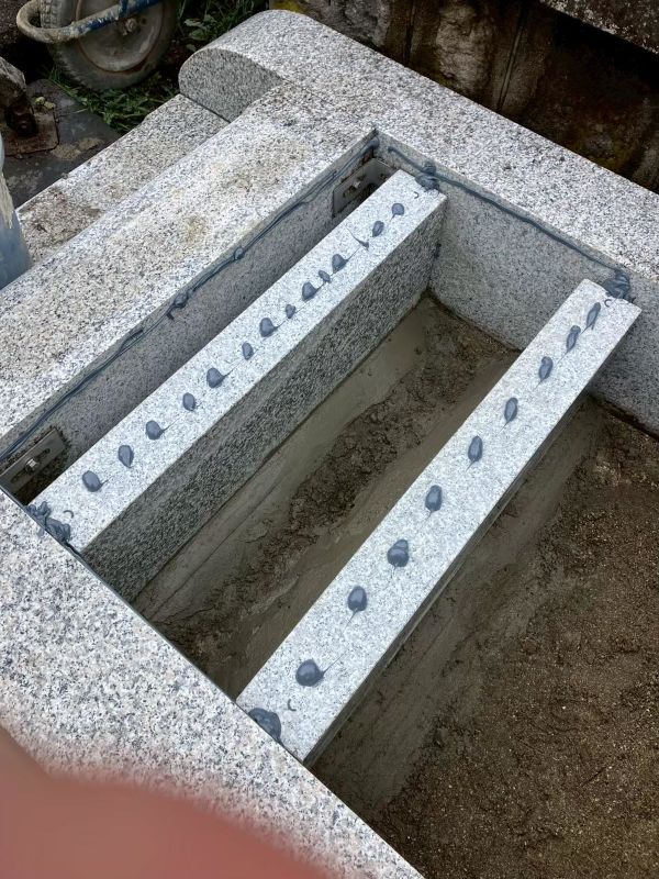まずは、外柵のクリーニングをして全体の水垢を落としました。こちらはお墓手前の石貼り部分です。下に支えの石を設置して、耐震ボンドで接着します。