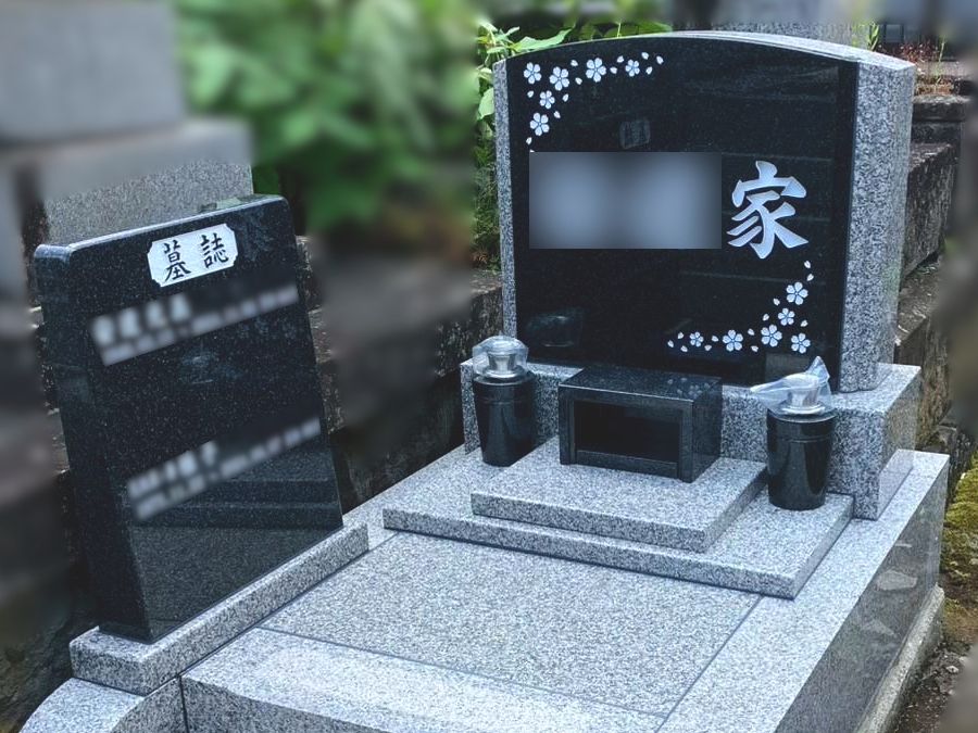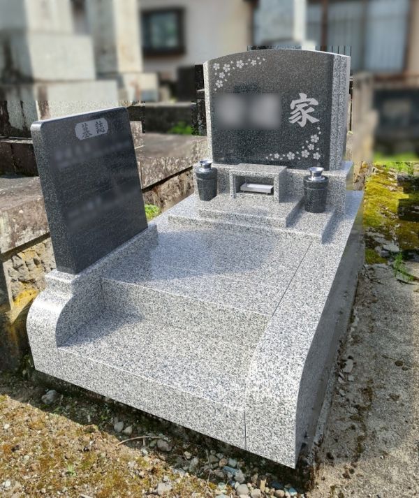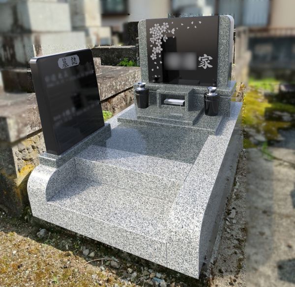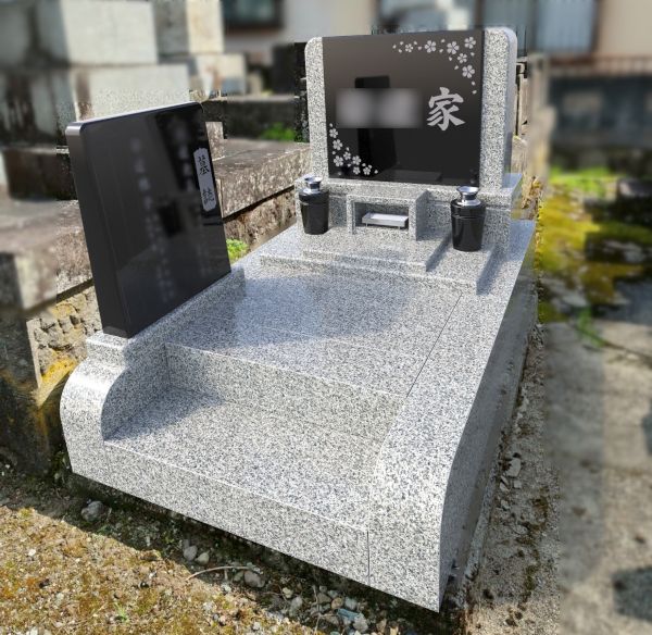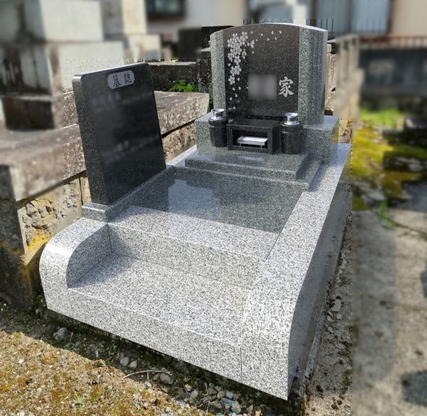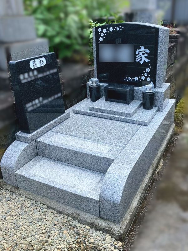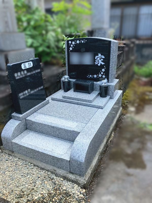 正面はご家名を大きく彫り、「花の彫刻を入れたい」というご希望で周りに桜をあしらいました。桜の枝などもご提案しましたが、「花びらの方がかわいらしい」というお母様のご意見でこちらをお選びになりました。棹石は、白御影石にインド産の黒御影石M10をはめ込んだ形になっています。