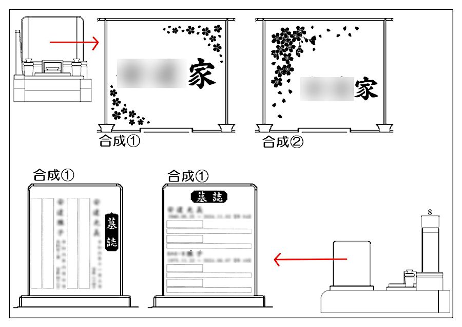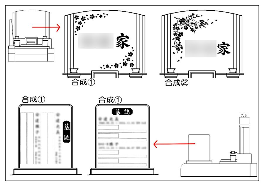 こちらは棹石のサイドに装飾が付いたお墓です。お墓のデザインの違いによって、桜や文字のバランスも違ってきます。墓誌は、縦書きと横書きの両方をご覧いただきました。
