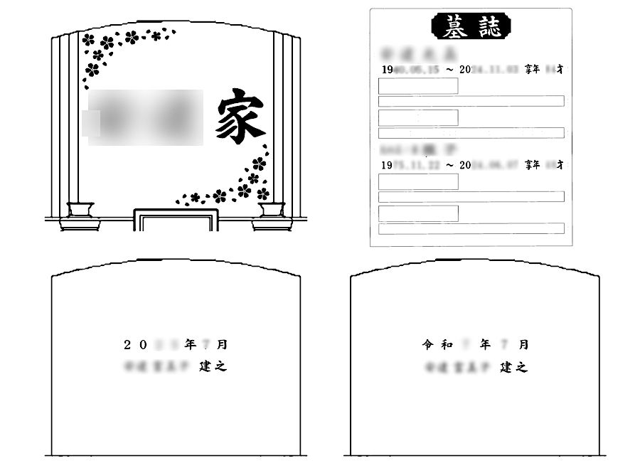 彫刻内容です。正面は大きく彫ったご家名の周りに桜の花をあしらい、墓誌は横書きで彫刻をします。墓誌は、ご戒名と亡くなられた年月日、ご生前のお名前とご年齢を彫刻したものが多いですが、「戒名だと分かりにくいので」ということから、今回はお名前を彫刻することになりました。お名前の下は、生年月日と亡くなられた年月日です。横書きなので、西暦で彫刻しています。また、お墓の背面は、元号と西暦をご提案して、墓誌にあわせて西暦をお選びになりました。