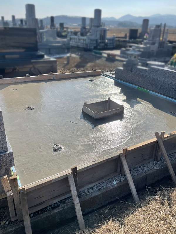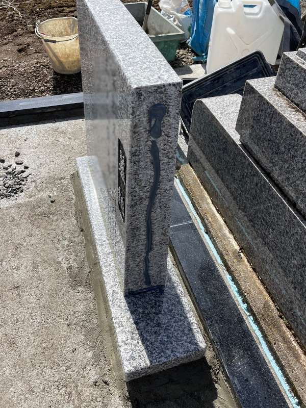 お墓の据え付け、ベンチ、墓誌の設置が終わりました。納骨室の蓋石を取り付けて、花立等を設置したら工事完了となります。