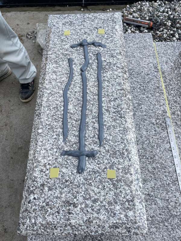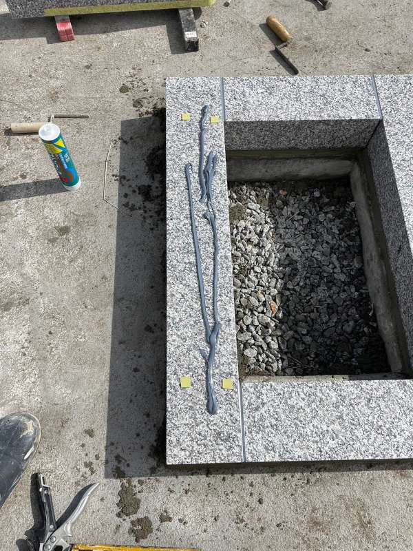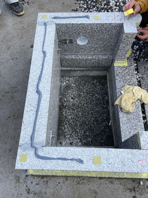墓誌の隣に塔婆立を取り付けるところです。耐震・免震のボンドをたっぷり使用して接着します。