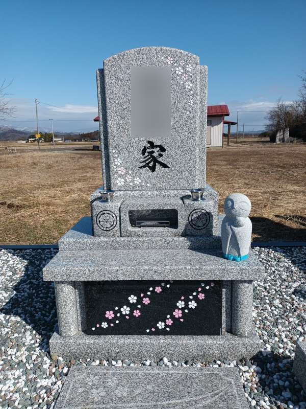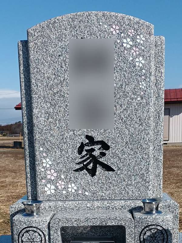 福島県一円にてお仕事をさせていただいております、お墓のTRY(トライ)です。郡山市地域墓地にて、桜の花がたくさんちりばめられた、高さのある華やかで明るい洋型墓石を建立させていただきました!