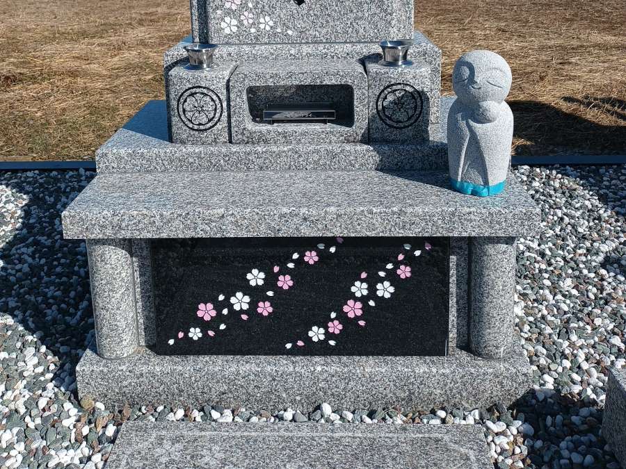 納骨室の扉にも同じく桜を流れるようにデザインし、白とピンクを入れました。お地蔵様は、お店で展示しているお地蔵様をご覧になり、昔ながらの立派なお地蔵様よりも「かわいらしいお地蔵様もいいね」とお選びになりました。