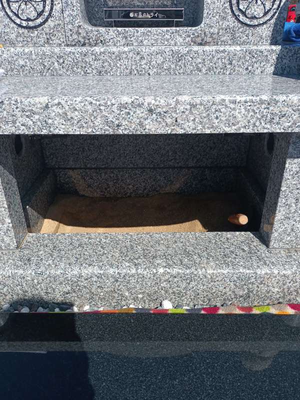 納骨室の蓋石を開けるとこのようになっています。底には山砂を敷き詰めており、このままお骨壺を置くこともできますし、お骨壺から取り出して土に直接埋葬することもできます。納骨室内に湿気が溜まらないようにする換気口は、左右に取り付けています。