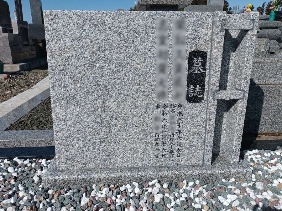 お墓の左手にある墓誌です。左側が墓地で、右側に塔婆立がある一体型になっています。塔婆を立てたとき墓誌と一緒に見ることができます。こちらはご提案して採用いただきました。