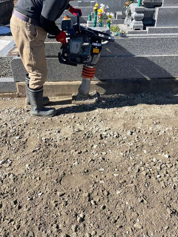 工事が始まりました。基礎工事のため砕石を敷いて、地固めをしています。