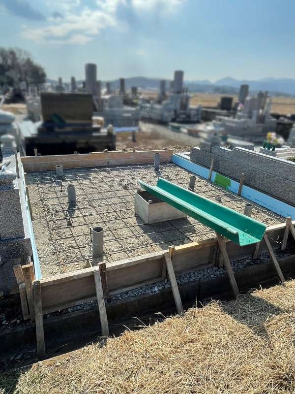 木枠を組んで、コンクリートを流し込む準備をしています。真ん中の木枠は納骨堂の底にあたる場所で、土のまま仕上げるため木枠で囲み、要所要所に水抜き穴を設けています。