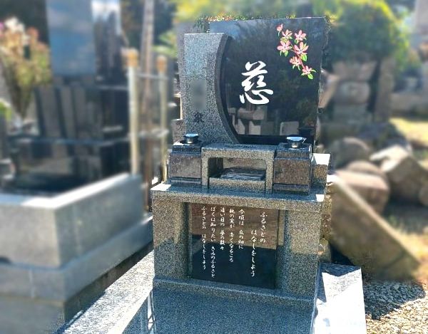 鏡石町の地域墓地にて、丘カロートタイプの寿陵墓を建立しました。優しい「慈」の文字と、ピンクのハナミズキが印象的なお墓です。ご家族や故郷への想いを込め、歌の一節を刻んだ現代的なお墓。立ったままお参りでき、お手入れもしやすい仕様です。